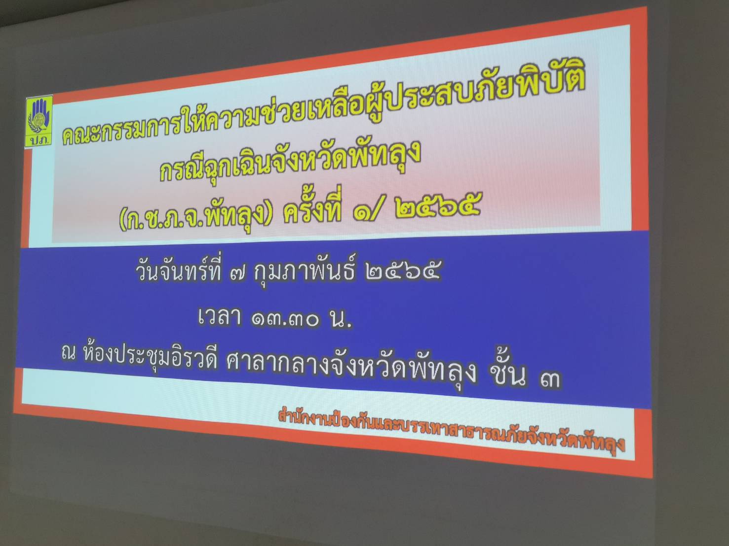ณ ห้องประชุมอิรวดี (ชั้น 3) ศาลากลางจังหวัดพัทลุง  อำเภอเมืองพัทลุง จังหวัดพัทลุงวันที่ 7 กุมภาพันธ์ 2565 เวลา 13.30 -16.00 น. นายภูษิต  จันทร์เพชร ประมงจังหวัดพัทลุง ร่วมประชุมคณะกรรมการให้ความช่วยเหลือผู้ประสบภัยพิบัติจังหวัดพัทลุง (ก.ช.ภ.จ.พัทลุง) ครั้งที่ 1/2565 โดยมีนายฉัตรชัย อุสาหะ เป็นประธานการประชุม ตามที่จังหวัดพัทลุงได้เกิดสถานการณ์อุทกภัย ตั้งแต่วันที่ 28 พฤศจิกายน 2564 สิ้นสุดเมื่อวันที่ 10 มกราคม 2565  ในพื้นที่อำเภอปากพะยูน ศรีนครินทร์ ป่าบอน กงหรา ควนขนุน เมืองพัทลุง ศรีบรรพต และอำเภอเขาชัยสน รวม 8 อำเภอ 47 ตำบล 359 หมู่บ้าน เพื่อให้หน่วยงานที่เกี่ยวข้องดำเนินการช่วยเหลือผู้ประสบภัยพิบัติตามหลักเกณฑ์และวิธีการที่กระทรวงการคลังกำหนด