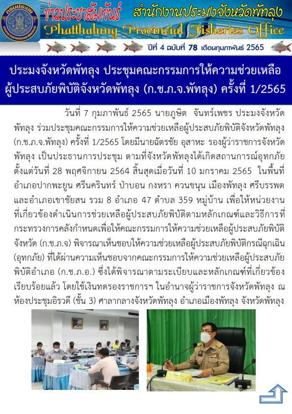 วันที่ 7 กุมภาพันธ์ 2565 เวลา 13.30 -16.00 น. นายภูษิต  จันทร์เพชร ประมงจังหวัดพัทลุง ร่วมประชุมคณะกรรมการให้ความช่วยเหลือผู้ประสบภัยพิบัติจังหวัดพัทลุง (ก.ช.ภ.จ.พัทลุง) ครั้งที่ 1/2565 โดยมีนายฉัตรชัย อุสาหะ รองผู้ว่าราชการจังหวัดพัทลุง เป็นประธานการประชุม ตามที่จังหวัดพัทลุงได้เกิดสถานการณ์อุทกภัย ตั้งแต่วันที่ 28 พฤศจิกายน 2564 สิ้นสุดเมื่อวันที่ 10 มกราคม 2565  ในพื้นที่อำเภอปากพะยูน ศรีนครินทร์ ป่าบอน กงหรา ควนขนุน เมืองพัทลุง ศรีบรรพต และอำเภอเขาชัยสน รวม 8 อำเภอ 47 ตำบล 359 หมู่บ้าน เพื่อให้หน่วยงานที่เกี่ยวข้องดำเนินการช่วยเหลือผู้ประสบภัยพิบัติตามหลักเกณฑ์และวิธีการที่กระทรวงการคลังกำหนด