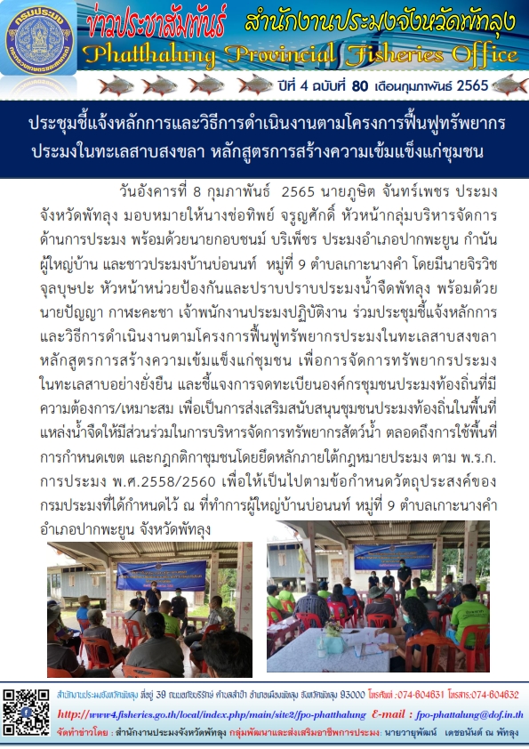 บริเพ็ชร ประมงอำเภอปากพะยูน กำนัน ผู้ใหญ่บ้าน และชาวประมงบ้านบ่อนนท์  หมู่ที่ 9 ตำบลเกาะนางคำ โดยมีนายจิรวิช จุลบุษปะ หัวหน้าหน่วยป้องกันและปราบปราบประมงน้ำจืดพัทลุง พร้อมด้วย  นายปัญญา กาฬะคะชา เจ้าพนักงานประมงปฏิบัติงาน ร่วมประชุมชี้แจ้งหลักการและวิธีการดำเนินงานตามโครงการฟื้นฟูทรัพยากรประมงในทะเลสาบสงขลา หลักสูตรการสร้างความเข้มแข็งแก่ชุมชน เพื่อการจัดการทรัพยากรประมง ในทะเลสาบอย่างยั่งยืน และชี้แจงการจดทะเบียนองค์กรชุมชนประมงท้องถิ่นที่มีความต้องการ/เหมาะสม เพื่อเป็นการส่งเสริมสนับสนุนชุมชนประมงท้องถิ่นในพื้นที่แหล่งน้ำจืดให้มีส่วนร่วมในการบริหารจัดการทรัพยากรสัตว์น้ำ ตลอดถึงการใช้พื้นที่การกำหนดเขต และกฎกติกาชุมชนโดยยึดหลักภายใต้กฎหมายประมง ตาม พ.ร.ก.       การประมง พ.ศ.2558/2560 เพื่อให้เป็นไปตามข้อกำหนดวัตถุประสงค์ของกรมประมงที่ได้กำหนดไว้ ณ ที่ทำการผู้ใหญ่บ้านบ่อนนท์ หมู่ที่ 9 ตำบลเกาะนางคำ อำเภอปากพะยูน จังหวัดพัทลุง