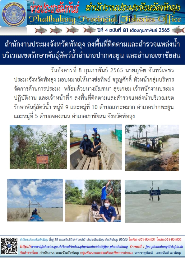 วันอังคารที่ 8 กุมภาพันธ์ 2565 นายภูษิต จันทร์เพชร ประมงจังหวัดพัทลุง มอบหมายให้นางช่อทิพย์ จรูญศักดิ์ หัวหน้ากลุ่มบริหารจัดการด้านการประมง พร้อมด้วยนางมัณฑนา สุขเกษม เจ้าพนักงานประมงปฎิบัติงาน และเจ้าหน้าที่ฯ ลงพื้นที่ติดตามและสำรวจแหล่งน้ำบริเวณเขตรักษาพันธุ์สัตว์น้ำ หมู่ที่ 9 และหมู่ที่ 10 ตำบลเกาะหมาก อำเภอปากพะยูน และหมู่ที่ 5 ตำบลจองถนน อำเภอเขาชัยสน จังหวัดพัทลุง