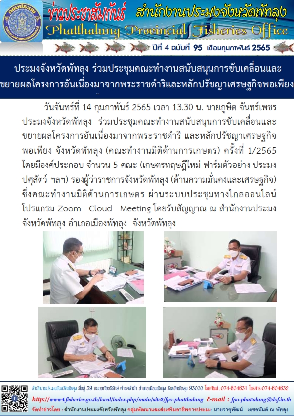 วันจันทร์ที่ 14 กุมภาพันธ์ 2565 เวลา 13.30 น. นายภูษิต จันทร์เพชร ประมงจังหวัดพัทลุง  ร่วมประชุมคณะทำงานสนับสนุนการขับเคลื่อนและขยายผลโครงการอันเนื่องมาจากพระราชดำริ และหลักปรัชญาเศรษฐกิจพอเพียง จังหวัดพัทลุง (คณะทำงานมิติด้านการเกษตร) ครั้งที่ 1/2565 โดยมีองค์ประกอบ จำนวน 5 คณะ (เกษตรทฤษฎีใหม่ ฟาร์มตัวอย่าง ประมง ปศุสัตว์ ฯลฯ) รองผู้ว่าราชการจังหวัดพัทลุง (ด้านความมั่นคงและเศรษฐกิจ)ซึ่งคณะทำงานมิติด้านการเกษตร ผ่านระบบประชุมทางไกลออนไลน์โปรแกรม Zoom Cloud Meeting โดยรับสัญญาณ ณ สำนักงานประมงจังหวัดพัทลุง อำเภอเมืองพัทลุง  จังหวัดพัทลุง