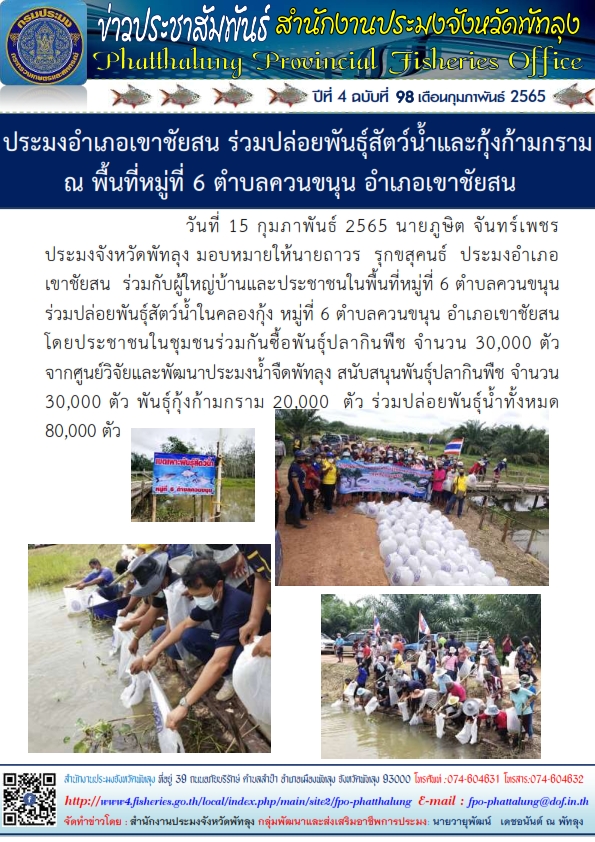 วันที่ 15 กุมภาพันธ์ 2565  นายภูษิต จันทร์เพชร ประมงจังหวัดพัทลุง หมอบหมายให้นายถาวร  รุกขสุคนธ์  ประมงอำเภอเขาชัยสน  ร่วมกับผู้ใหญ่บ้านและประชาชนในพื้นที่หมู่ที่  6  ตำบลควนขนุนร่วมปล่อยพันธุ์สัตว์น้ำในคลองกุ้ง  หมูที่  6  ตำบลควนขนุน  อำเภอเขาชัยสน  โดยราษฎรในชุมชนร่วมกันซื้อพันธุ์ปลากินพืช จำนวน  30,000  ตัว  ศูนย์วิจัยและพัฒนาประมงน้ำจืดพัทลุง สนับสนุนพันธุ์ปลากินพืช จำนวน 30,000 ตัว  พันธุ์กุ้งก้ามกราม  20,000  ตัว  รวมปล่อยพันธุ์น้ำทั้งหมด  80,000 ตัว