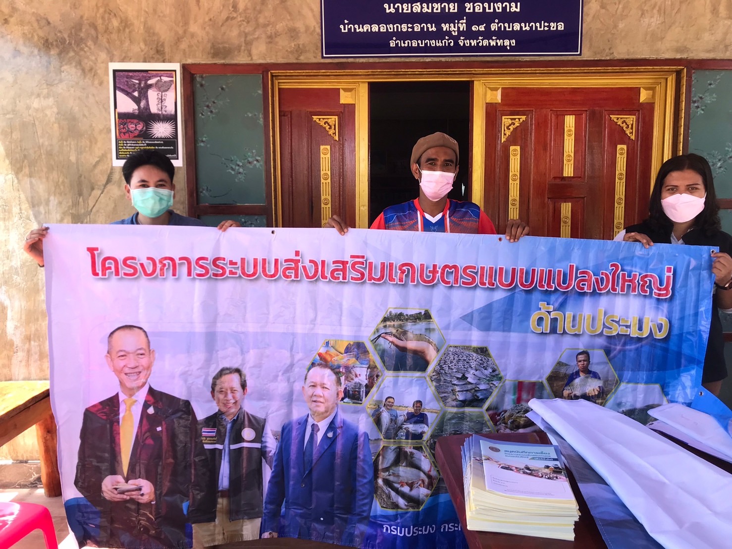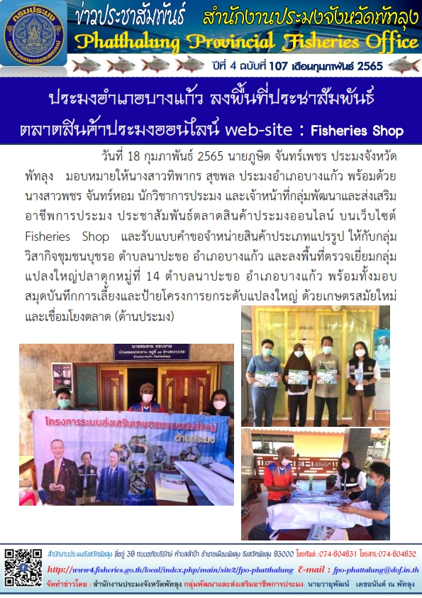วันที่ 18 กุมภาพันธ์ 2565 นายภูษิต จันทร์เพชร ประมงจังหวัดพัทลุง   มอบหมายให้นางสาวทิพากร สุขพล ประมงอำเภอบางแก้ว พร้อมด้วยนางสาวพชร จันทร์หอม นักวิชาการประมง และเจ้าหน้าที่กลุ่มพัฒนาและส่งเสริมอาชีพการประมง ประชาสัมพันธ์ตลาดสินค้าประมงออนไลน์ บนเว็บไซต์ Fisheries Shop และรับแบบคำขอจำหน่ายสินค้าประเภทแปรรูป ให้กับกลุ่มวิสากิจชุมชนบุชรอ ตำบลนาปะขอ อำเภอบางแก้ว และลงพื้นที่ตรวจเยี่ยมกลุ่มแปลงใหญ่ปลาดุกหมู่ที่ 14 ตำบลนาปะขอ อำเภอบางแก้ว พร้อมทั้งมอบสมุดบันทึกการเลี้ยงและป้ายโครงการยกระดับแปลงใหญ่ ด้วยเกษตรสมัยใหม่ และเชื่อมโยงตลาด (ด้านประมง)
