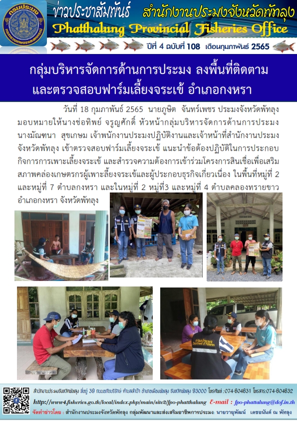 วันที่ 18 กุมภาพันธ์ 2565  นายภูษิต  จันทร์เพชร ประมงจังหวัดพัทลุง  มอบหมายให้นางช่อทิพย์ จรูญศักดิ์ หัวหน้ากลุ่มบริหารจัดการด้านการประมง นางมัณฑนา  สุขเกษม เจ้าพนักงานประมงปฏิบัติงานและเจ้าหน้าที่สำนักงานประมงจังหวัดพัทลุง เข้าตรวจสอบฟาร์มเลี้ยงจระเข้ แนะนำข้อต้องปฏิบัติในการประกอบกิจการการเพาะเลี้ยงจระเข้ และสำรวจความต้องการเข้าร่วมโครงการสินเชื่อเพื่อเสริมสภาพคล่องเกษตรกรผู้เพาะลี้ยงจระเข้และผู้ประกอบธุรกิจเกี่ยวเนื่อง ในพื้นที่หมู่ที่ 2 และหมู่ที่ 7 ตำบลกงหรา และในหมู่ที่ 2 หมู่ที่3 และหมู่ที่ 4 ตำบลคลองทรายขาว อำเภอกงหรา จังหวัดพัทลุง