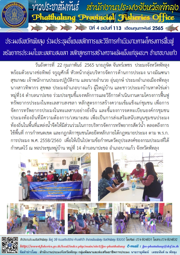 ประมงจังหวัดพัทลุง ร่วมประชุมชี้แจ้งหลักการและวิธีการดำเนินงานตามโครงการฟื้นฟูทรัพยากรประมงในทะเลสาบสงลา หลักสูตรการสร้างความเข้มแข็งแก่ชุมชนฯ อำเภอบางแก้ว
