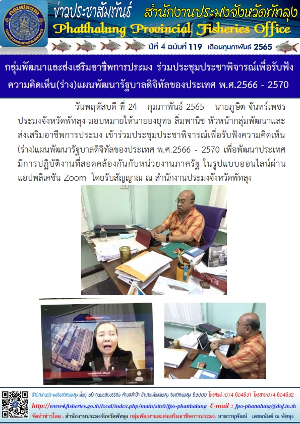 วันพฤหัสบดี ที่ 24 กุมภาพันธ์ 2565 นายภูษิต จันทร์เพชร ประมงจังหวัดพัทลุง มอบหมายให้ นายยงยุทธ ลิ่มพานิช หัวหน้ากลุ่มพัฒนาและส่งเสริมอาชีพการประมง เข้าร่วมประชุมประชาพิจารณ์เพื่อรับฟังความคิดเห็น(ร่าง)แผนพัฒนารัฐบาลดิจิทัลของประเทศ พ.ศ.2566 - 2570 ในรูปแบบออนไลน์ผ่านแอปพลิเคชัน Zoom  โดยรับสัญญาณ ณ สำนักงานประมงจังหวัดพัทลุง