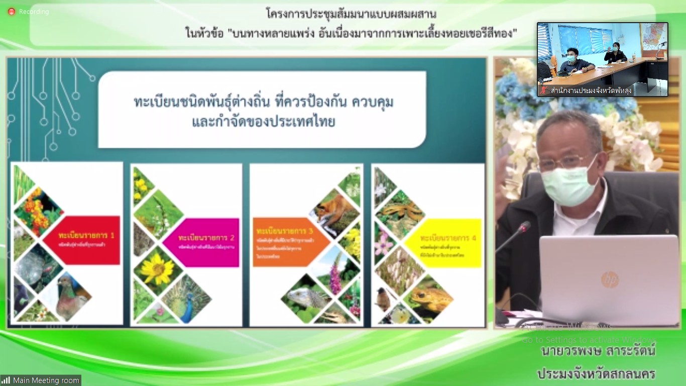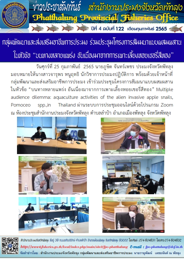 วันศุกร์ที่ 25 กุมภาพันธ์  2565 นายภูษิต จันทร์เพชร ประมงจังหวัดพัทลุง มอบหมายให้นางสาวจารุพร หนูฤทธิ นักวิชาการประมงปฏิบัติการ พร้อมด้วยเจ้าหน้าที่ กลุ่มพัฒนาและส่งเสริมอาชีพการประมง เข้าร่วมประชุมโครงการสัมมนาแบบผสมผสาน ในหัวข้อ “บนทางหลายแพร่ง อันเนื่องมาจากการเพาะเลี้ยงหอยเชอรี่สีทอง” Multiple audience dilemma: aquaculture activities of the alien invasive apple snails, Pomoceo spp.,in Thailand ผ่านระบบการประชุมออนไลน์ด้วยโปรแกรม Zoom ณ ห้องประชุมสำนักงานประมงจังหวัดพัทลุง ตำบลลำปำ อำเภอเมืองพัทลุง จังหวัดพัทลุง