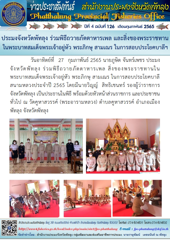 ประมงจังหวัดพัทลงุ ร่วมพิธีถวายภัตตาหารเพล และสิ่งของพระราชทาน ในพระบาทสมเด็จพระเจ้าอยู่หัว พระภิกษุ สามเณร ในการสอบประโยคบาลีฯ..คลิก