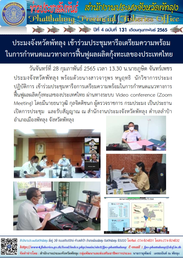 วันจันทร์ที่ 28 กุมภาพันธ์ 2565 เวลา 13.30 น.  นายภูษิต  จันทร์เพชร ประมงจังหวัดพัทลุง   พร้อมด้วยนางสาวจารุพร  หนูฤทธิ  นักวิชาการประมงปฏิบัติการ เข้าร่วมประชุมหารือการเตรียมความพร้อมในการกำหนดแนวทางการฟื้นฟูผลผลิตกุ้งะเลของประเทศไทย ผ่านทางระบบ Video conference (Zoom Meeting)  โดยมีนายธนาวุฒิ กุลจิตติชนก ผู้ตรวจราชการ กรมประมง เป็นประธานเปิดการประชุม  รับสัญญาณ ณ สำนักงานประมงจังหวัดพัทลุง ตำบลลำปำ อำเภอเมืองพัทลุง จังหวัดพัทลุง