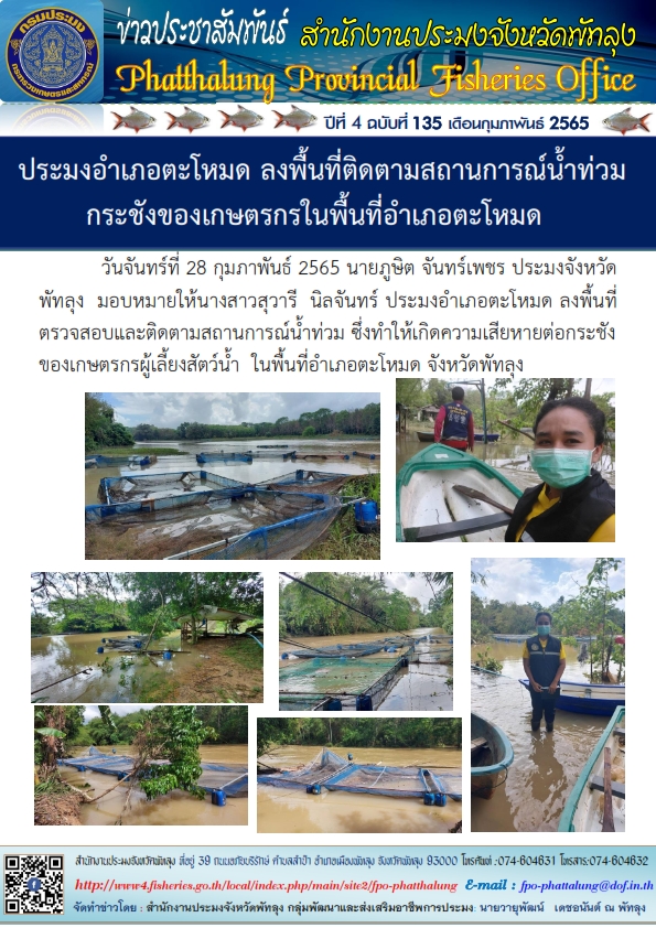 วันจันทร์ที่ 28 กุมภาพันธ์ 2565 นายภูษิต จันทร์เพชร ประมงจังหวัดพัทลุง มอบหมายให้นางสาวสุวารี นิลจันทร์ ประมงอำเภอตะโหมด ลงพื้นที่ตรวจสอบและติดตามสถานการณ์น้ำท่วม ซึ่งทำให้เกิดความเสียหายต่อกระชังของเกษตรกรผู้เลี้ยงสัตว์น้ำ ในพื้นที่อำเภอตะโหมด จังหวัดพัทลุง