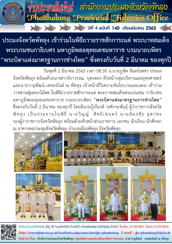 วันพุธที่ 2 มีนาคม 2565 เวลา 08.30 น.นายภูษิต จันทร์เพชร ประมงจังหวัดพัทลุง พร้อมด้วยนางสาวจิราวรรณ  บุตรทอง หัวหน้ากลุ่มบริหารและยุทธศาสตร์ และนายวายุพัฒน์ เดชอนันต์ ณ พัทลุง เจ้าหน้าที่วิเคราะห์นโยบายและแผน เข้าร่วมวางพานพุ่มดอกไม้สด ในพิธีถวายราชสักการะแด่ พระบาทสมเด็จพระบรมชนกาธิเบศร มหาภูมิพลอดุลยเดชมหาราช บรมนาถบพิตร “พระบิดาแห่งมาตรฐานการช่างไทย” ซึ่งตรงกับวันที่ 2 มีนาคม ของทุกปี โดยมีนายกู้เกียรติ วงศ์กระพันธุ์ ผู้ว่าราชการจังหวัดพัทลุง เป็นประธานในพิธี นายวิญญ์  สิทธิเชนทร์ นายฉัตรชัย อุสาหะ รองผู้ว่าราชการจังหวัดพัทลุง พร้อมด้วยหัวหน้าส่วนราชการ เอกชน นักเรียน นักศึกษา ณ อาคารหอประชุมจังหวัดพัทลุง อำเภอเมืองพัทลุง จังหวัดพัทลุง