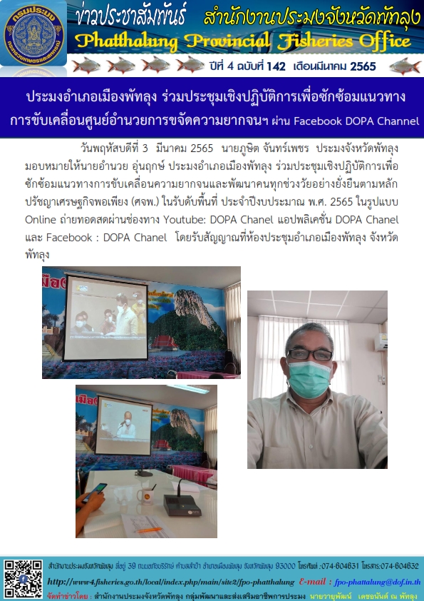 วันพฤหัสบดีที่ 3 มีนาคม 2565 นายภูษิต จันทร์เพชร ประมงจังหวัดพัทลุง มอบหมายให้นายอำนวย อุ่นฤกษ์ ประมงอำเภอเมืองพัทลุง ร่วมประชุมเชิงปฏิบัติการเพื่อซักซ้อมแนวทางการขับเคลื่อนความยากจนและพัฒนาคนทุกช่วงวัยอย่างยั่งยืนตามหลักปรัชญาเศรษฐกิจพอเพียง(ศจพ.) ในรับดับพื้นที่ ประจำปีงบประมาณ พ.ศ.2565 ในรูปแบบ Online ถ่ายทอดสดผ่านช่องทาง Youtube:DOPA Chanel แอปพลิเคชั่น DOPA Chanel และ Facebook : DOPA Chanel โดยรับสัญญาณที่ห้องประชุมอำเภอเมืองพัทลุง จังหวัดพัทลุง