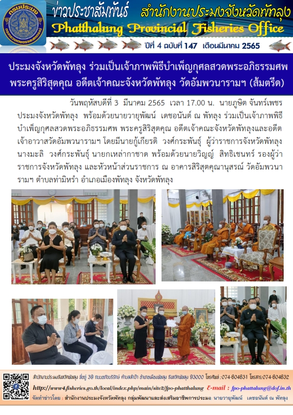 ประมงจังหวัด ร่วมเป็นเจ้าภาพพิธีบำเพ็ญกุศลสวดพระอภิธรรมศพพระครูสิริสุตคุณ อดีตเจ้าคณะจังหวัดพัทลุง วัดอัมพวนารามฯ(ส้มตรีด)