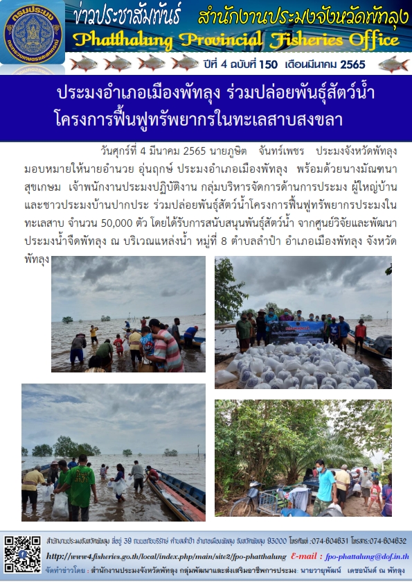 วันศุกร์ที่ 4 มีนาคม 2565 นายภูษิต จันทร์เพชร ประมงจังหวัดพัทลุง  มอบหมายให้นายอำนวย อุ่นฤกษ์ ประมงอำเภอเมืองพัทลุง  พร้อมด้วยนางมัณฑนา สุขเกษม  เจ้าพนักงานประมงปฏิบัติงาน กลุ่มบริหารจัดการด้านการประมง ผู้ใหญ่บ้าน และชาวประมงบ้านปากประ ร่วมปล่อยพันธุ์สัตว์น้ำ โครงการฟื้นฟูทรัพยากรประมงใน ทะเลสาบ จำนวน 50,000 ตัว โดยได้รับการสนับสนุนพันธุ์สัตว์น้ำ จากศูนย์วิจัยและพัฒนา ประมงน้ำจืดพัทลุง ณ บริเวณแหล่งน้ำ หมู่ที่ 8 ตำบลลำปำ อำเภอเมืองพัทลุง จังหวัดพัทลุง