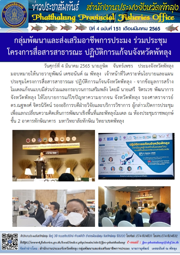วันศุกร์ที่ 4 มีนาคม 2565 นายภูษิต จันทร์เพชร ประมงจังหวัดพัทลุง มอบหมายให้นายวายุพัฒน์ เดชอนันต์ ณ พัทลุง  เจ้าหน้าที่วิเคราะห์นโยบายและแผน ประชุมโครงการสื่อสารสาธารณะ ปฏิบัติการแก้จนจังหวัดพัทลุง - จากข้อมูลการสร้างโมเดลแก้จนแบบมีส่วนร่วมและกระบวนการเสริมพลัง โดยมี นายเสรี  จิตรเวช พัฒนาการจังหวัดพัทลุง ให้โยบายการแก้ไขปัญหาความยากจน จังหวัดพัทลุง รองศาตราจารย์ ดร.ณฐพงศ์ จิตรนิรัตน์ รองอธิการบดีฝ่ายวิจัยและบริการวิชาการ ผู้กล่าวเปิดการประชุม  เพื่อแลกเปลี่ยนความคิดเห็นการพัฒนาเขิงพื้นที่และพัทลุงโมเดล ณ ห้องประชุมราชพฤกษ์ ชั้น 2 อาคารทักษิณาคาร  มหาวิทยาลัยทักษิณ วิทยาเขตพัทลุง