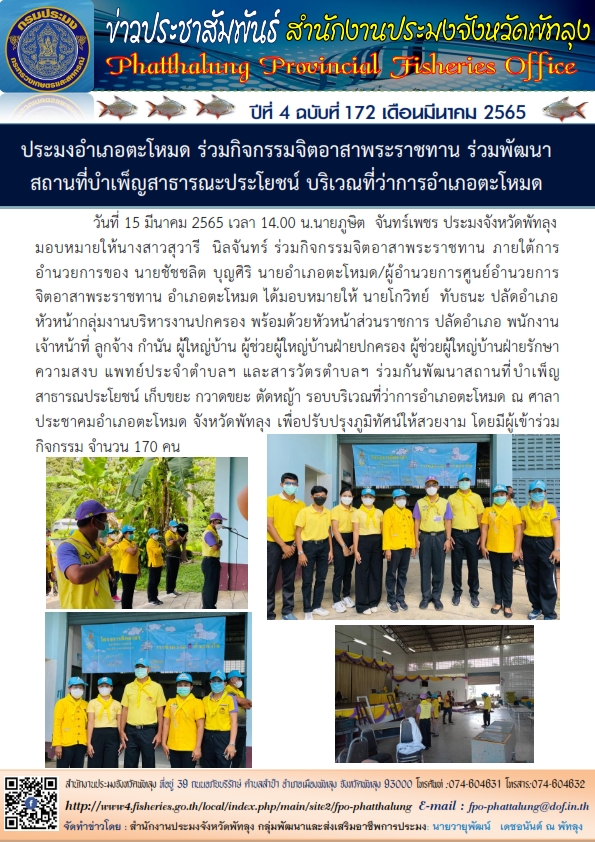 วันที่ 15 มีนาคม 2565 เวลา 14.00 น.นายภูษิต  จันทร์เพชร ประมงจังหวัดพัทลุง มอบหมายให้นางสาวสุวารี  นิลจันทร์ ร่วมกิจกรรมจิตอาสาพระราชทาน ภายใต้การอำนวยการของ นายชัชชลิต บุญศิริ นายอำเภอตะโหมด/ผู้อำนวยการศูนย์อำนวยการ  จิตอาสาพระราชทาน อำเภอตะโหมด ได้มอบหมายให้ นายโกวิทย์  ทับธนะ ปลัดอำเภอหัวหน้ากลุ่มงานบริหารงานปกครอง พร้อมด้วยหัวหน้าส่วนราชการ ปลัดอำเภอ พนักงานเจ้าหน้าที่ ลูกจ้าง กำนัน ผู้ใหญ่บ้าน ผู้ช่วยผู้ใหญ่บ้านฝ่ายปกครอง ผู้ช่วยผู้ใหญ่บ้านฝ่ายรักษาความสงบ แพทย์ประจำตำบลฯ และสารวัตรตำบลฯ ร่วมกันพัฒนาสถานที่บำเพ็ญสาธารณประโยชน์ เก็บขยะ กวาดขยะ ตัดหญ้า รอบบริเวณที่ว่าการอำเภอตะโหมด ณ ศาลาประชาคมอำเภอตะโหมด จังหวัดพัทลุง เพื่อปรับปรุงภูมิทัศน์ให้สวยงาม โดยมีผู้เข้าร่วมกิจกรรม จำนวน 170 คน