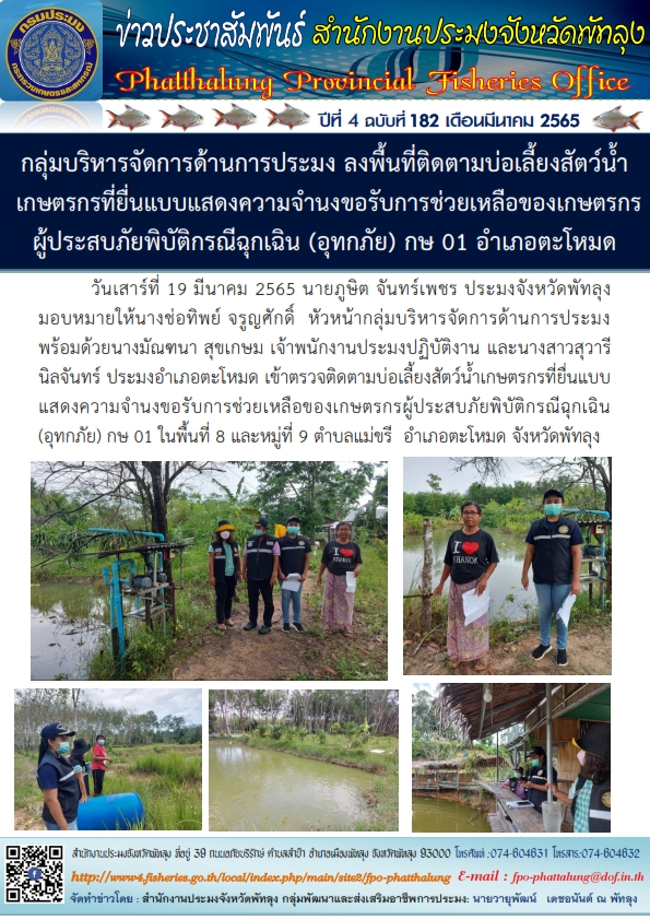 วันเสาร์ที่ 19 มีนาคม 2565 นายภูษิต จันทร์เพชร ประมงจังหวัดพัทลุง มอบหมายให้นางช่อทิพย์ จรูญศักดิ์  หัวหน้ากลุ่มบริหารจัดการด้านการประมง         พร้อมด้วยนางมัณฑนา สุขเกษม เจ้าพนักงานประมงปฏิบัติงาน และนางสาวสุวารี  นิลจันทร์ ประมงอำเภอตะโหมด เข้าตรวจติดตามบ่อเลี้ยงสัตว์น้ำเกษตรกรที่ยื่นแบบแสดงความจำนงขอรับการช่วยเหลือของเกษตรกรผู้ประสบภัยพิบัติกรณีฉุกเฉิน (อุทกภัย) กษ 01 ในพื้นที่ 8 และหมู่ที่ 9 ตำบลแม่ขรี  อำเภอตะโหมด จังหวัดพัทลุง