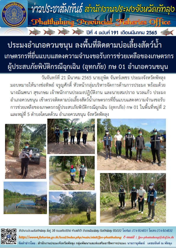 ประมงอำเภอควนขนุน ลงพื้นที่ติดตามบ่อเลี้ยงสัตว์น้ำ เกษตรกรท่ียื่นแบบแสดงความจำนงขอรับการช่วยเหลือของเกษตรกร ผู้ประสบภัยพิบัติกรณีฉุกเฉิน (อุทกภัย) กษ 01 อำเภอควนขนุน..คลิก
