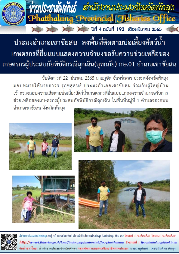 วันที่ 22 มีนาคม 2565 นายภูษิต จันทร์เพชร ประมงจังหวัดพัทลุง มอบหมายให้นายถาวร  รุกขสุคนธ์ ประมงอำเภอเขาชัยสน  ร่วมกับผู้ใหญ่บ้าน เข้าตรวจสอบความเสียหายบ่อเลี้ยงสัตว์น้ำเกษตรกรที่ยื่นแบบแสดงความจำนงขอรับการช่วยเหลือของเกษตรกรผู้ประสบภัยพิบัติกรณีฉุกเฉิน  ในพื้นที่ หมู่ที่ 1 ตำบลจองถนน  อำเภอเขาชัยสน จังหวัดพัทลุง