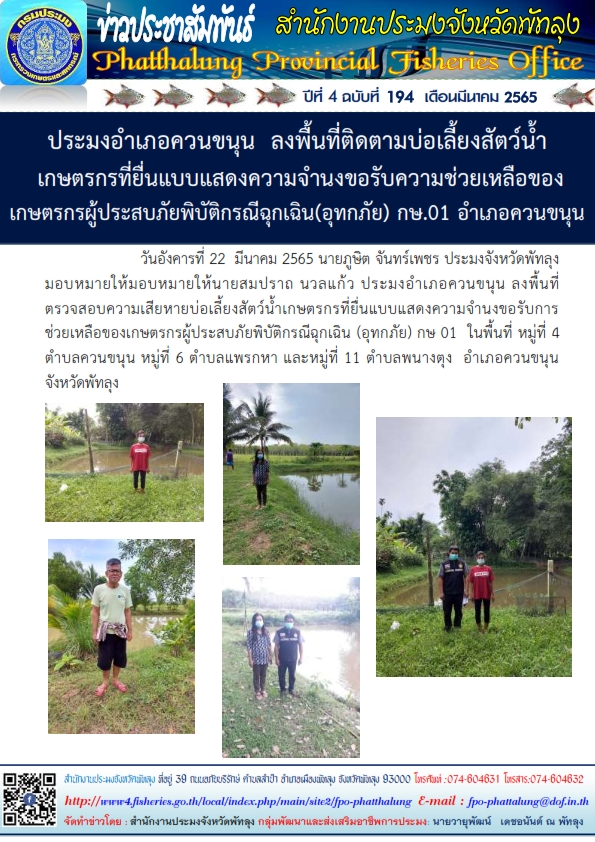 วันที่ 22 มีนาคม 2565  นายภูษิต จันทร์เพชร ประมงจังหวัดพัทลุง มอบหมายให้นายสมปราถ นวลแก้ว ประมงอำเภอควนขนุน ลงพื้นที่ตรวจสอบความเสียหายบ่อเลี้ยงสัตว์น้ำเกษตรกรที่ยื่นแบบแสดงความจำนงขอรับการช่วยเหลือของเกษตรกรผู้ประสบภัยพิบัติกรณีฉุกเฉิน  ในพื้นที่ หมู่ที่ 4 ตำบลควนขนุน หมู่ที่ 6 ตำบลแพรกหา และหมู่ที่ 11 ตำบลพนางตุง  อำเภอควนขนุน จังหวัดพัทลุง