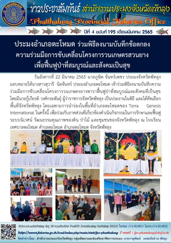วันอังคารที่ 22 มีนาคม 2565 นายภูษิต จันทร์เพชร ประมงจังหวัดพัทลุง มอบหมายให้นางสาวสุวารี  นิลจันทร์ ประมงอำเภอตะโหมด เข้าร่วมพิธีลงนามบันทึกความร่วมมือการขับเคลื่อนโครงการวนเกษตรยางพาราฟื้นฟูป่าที่สมบูรณ์และสังคมที่เป็นสุข โดยมีนายกู้เกียรติ วงศ์กระพันธุ์ ผู้ว่าราชการจังหวัดพัทลุง เป็นประธานในพิธี และได้คัดเลือกพื้นที่จังหวัดพัทลุง โดยเฉพาะการนำร่องในพื้นที่อำเภอตะโหมดของ Terra Genesis International ในครั้งนี้ เพื่อร่วมกับภาคส่วนที่เกี่ยวข้องดำเนินกิจกรรมในการรักษาและฟื้นฟูระบบนิเวศน์ วัฒนธรรมคุณภาพของดิน ป่าไม้ และชุมชนของจังหวัดพัทลุง ณ โรงเรียนเทศบาลตะโหมด ตำบลตะโหมด อำเภอตะโหมด จังหวัดพัทลุง