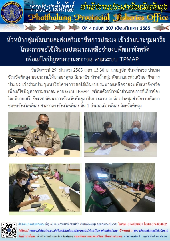 วันอังคาร 29 มีนาคม 2565 เวลา 13.30 น. นายภูษิต จันทร์เพชร ประมงจังหวัดพัทลุง มอบหมายให้นายยงยุทธ ลิ่มพานิช หัวหน้ากลุ่งพัฒนาและส่งเสริมอาชีพการประมง เข้าร่วประชุมโครงการขจัดความยากจนคนเมืองลุง พัฒนาคุณภาพชีวติตามระบบ TPMAP พร้อมด้วยหัวหน้าส่วนราชการที่เกี่ยวข้องโดยมี นายเสรี จิตเวช พัฒนาการจังหวัดพัทลุง เป็นประธาน ณ ห้องประชุมสำนักงานพัฒนาชุมชนจังหวัดพัทลุง ศาลากลางจังหวัดพัทลุง ขั้น 1 อำเภอเมืองพัทลุง จังหวัดพัทลุง