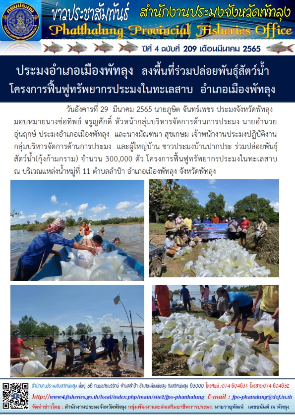 วันอังคารที่ 29  มีนาคม 2565 นายภูษิต จันทร์เพชร ประมงจังหวัดพัทลุง  มอบหมายนางช่อทิพย์ จรูญศักดิ์ หัวหน้ากลุ่มบริหารจัดการด้านการประมง นายอำนวย อุ่นฤกษ์ ประมงอำเภอเมืองพัทลุง  และนางมัณฑนา สุขเกษม เจ้าพนักงานประมงปฏิบัติงาน กลุ่มบริหารจัดการด้านการประมง  และผู้ใหญ่บ้าน ชาวประมงบ้านปากประ ร่วมปล่อยพันธุ์สัตว์น้ำ(กุ้งก้ามกราม) จำนวน 300,000 ตัว โครงการฟื้นฟูทรัพยากรประมงในทะเลสาบ ณ บริเวณแหล่งน้ำหมู่ที่ 11 ตำบลลำปำ อำเภอเมืองพัทลุง จังหวัดพัทลุง