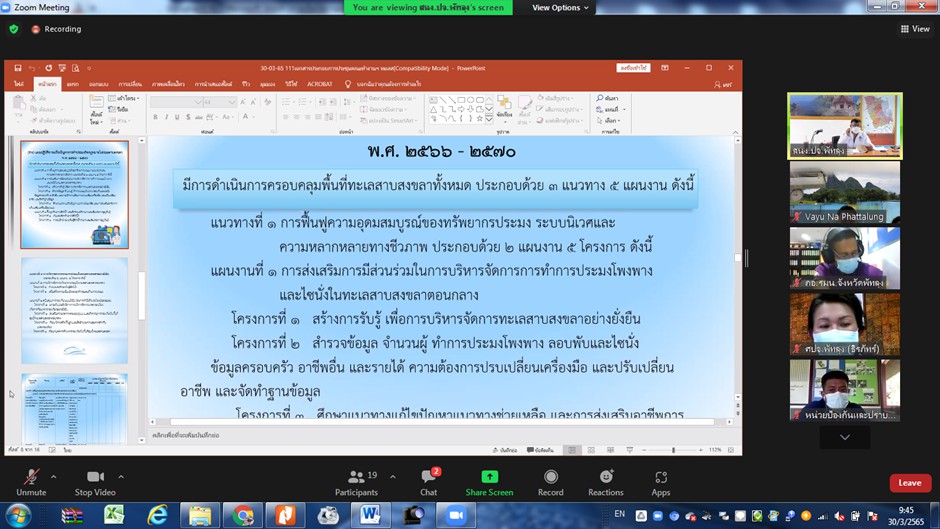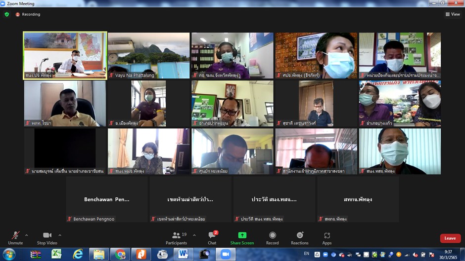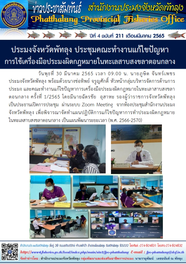 วันพุธที่ 30 มีนาคม 2565 เวลา 09.00 นายภูษิต จันทร์เพชร ประมงจังหวัดพัทลุง พร้อมด้วยนางช่อทิพย์ จรูญศักดิ์ หัวหน้ากลุ่มบริหารจัดการด้านการประมง และคณะทำงานแก้ไขปัญหาเครื่องมือประมงผิดกฎหมายในทะเลสาบสงขลาตอนกลาง ครั้งที่ 1/2565 โดยมีนายฉัตรชัย อุสาหะ รองผู้ว่าราชการจังหวัดพัทลุง เป็นประธานเปิดการประชุม ผ่านระบบ Zoom Meeting จากห้องประชุมสำนักงานประมงจังหวัดพัทลุง เพื่อพิจารณาจัดทำแผนปฏิบัติการแก้ไขปัญหาการทำประมงผิดกฎหมายในทะเลสาบสงขลาตอนกลาง เป็นแผนพัฒนาระยะเวลา (พ.ศ.2566 - 2570)