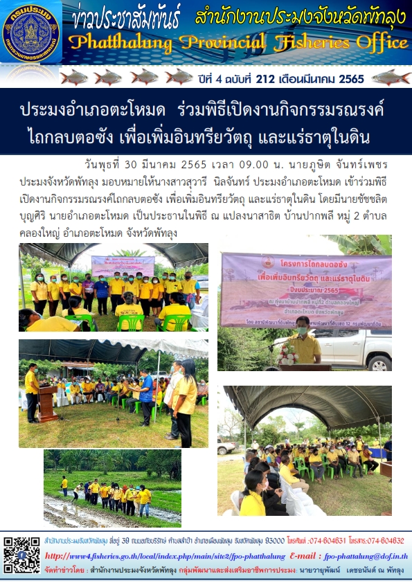 วันพุธที่ 30 มีนาคม 2565 เวลา 09.00 น. นายภูษิต จันทร์เพชร ประมงจังหวัดพัทลุง มอบหมายให้นางสาวสุวารี  นิลจันทร์ ประมงอำเภอตะโหมด เข้าร่วมพิธีเปิดงานกิจกรรมรณรงค์ไถกลบตอซัง เพื่อเพิ่มอินทรียวัตถุ และแร่ธาติในดิน โดยมีนายชัชชลิต  บุญศิริ นายอำเภอตะโหมด เป็นประธานในพิธี ณ แปลงนาสาธิต บ้านปากพลี หมู่ 2 ตำบลคลองใหญ่ อำเภอตะโหมดจังหวัดพัทลุง