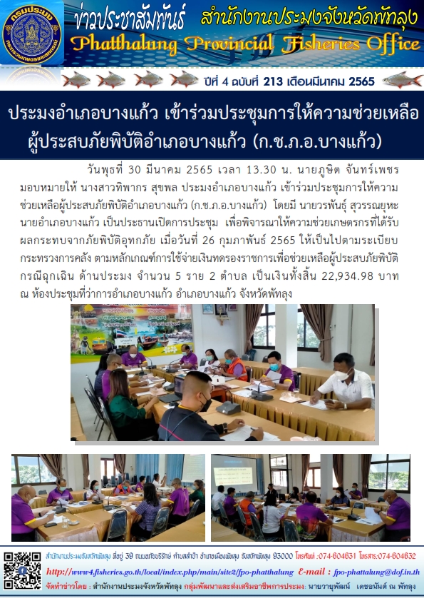 วันที่ 30 มีนาคม 2565 เวลา 13.30 น. นายภูษิต จันทร์เพชร ประมงจังหวัดพัทลุง มอบหมายให้ นางสาวทิพากร สุขพล ประมงอำเภอบางแก้ว เข้าร่วมประชุมการให้ความช่วยเหลือผู้ประสบภัยพิบัติอำเภอบางแก้ว (ก.ช.ภ.อ.บางแก้ว) โดยมี นายวรพันธุ์ สุวรรณยุหะ นายอำเภอบางแก้ว เป็นประธานที่ประชุม เพื่อประชุมพิจารณาให้ความช่วยเกษตรกร ที่ได้รับผลกระทบจากภัยพิบัติอุทกภัย เมื่อวันที่ 26 กุมภาพันธ์ 2565 ให้เป็นไปตามระเบียบกระทรวงการคลัง ตามหลักเกณฑ์การใช้จ่ายเงินทดรองราชการเพื่อช่วยเหลือผู้ประสบภัยพิบัติกรณีฉุกเฉิน ด้านประมง จำนวน 5 ราย 2 ตำบล เป็นเงินทั้งสิ้น 22,934.98 บาท ณ ห้องประชุมที่ว่าการอำเภอบางแก้ว อำเภอบางแก้ว จังหวัดพัทลุง