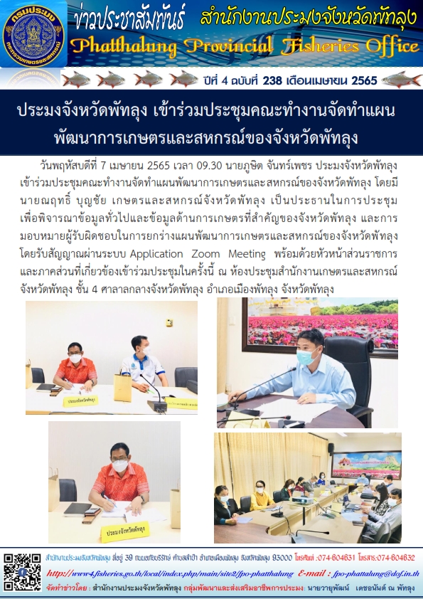 วันพฤหัสบดีที่ 7 เมษายน 2565 เวลา 09.30 นายภูษิต จันทร์เพชร ประมงจังหวัดพัทลุง   เข้าร่วมประชุมคณะทำงานจัดทำแผนพัฒนาการเกษตรและสหกรณ์ของจังหวัดพัทลุง โดยมี นายณฤทธิ์ บุญชัย เกษตรและสหกรณ์จังหวัดพัทลุง เป็นประธานในการประชุม เพื่อพิจารณาข้อมูลทั่วไปและข้อมูลด้านการเกษตรที่สำคัญของจังหวัดพัทลุง และการ มอบหมายผู้รับผิดชอบในการยกร่างแผนพัฒนาการเกษตรและสหกรณ์ของจังหวัดพัทลุง  โดยรับสัญญาณผ่านระบบ Application Zoom Meeting พร้อมด้วยหัวหน้าส่วนราชการ และภาคส่วนที่เกี่ยวข้องเข้าร่วมประชุมในครั้งนี้ ณ ห้องประชุมสำนักงานเกษตรและสหกรณ์ จังหวัดพัทลุง ชั้น 4 ศาลาลกลางจังหวัดพัทลุง อำเภอเมืองพัทลุง จังหวัดพัทลุง