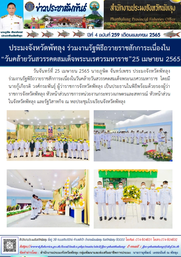 ประมงจังหวัดพัทลุง ร่วมงานรัฐพิธีถวายราชสักการะเนื่องใน "วันคล้ายวันสวรรคตสมเด็จพระนเรศวรมหาราช" 25 เมษายน 2565