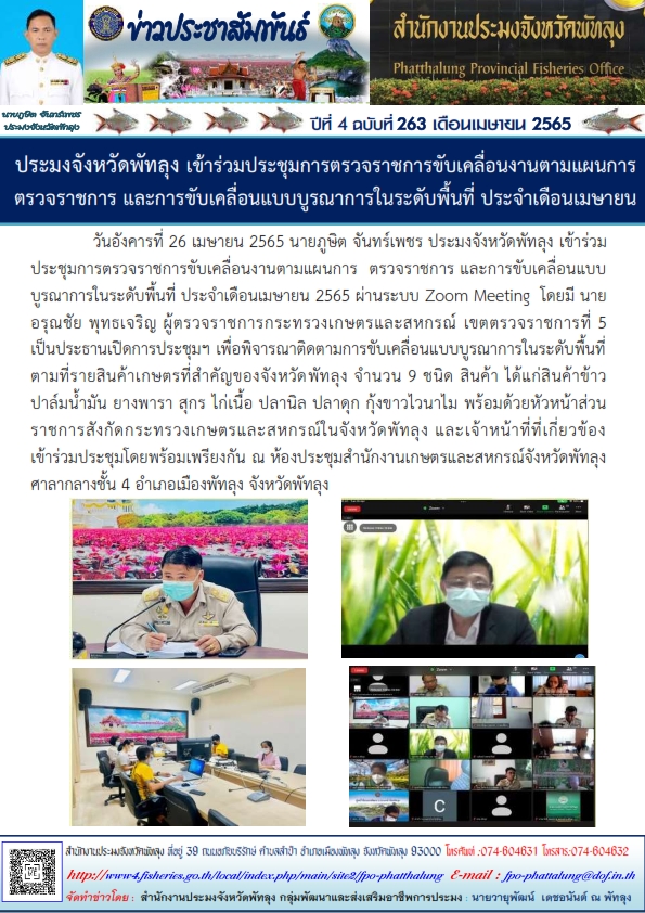 วันอังคารที่ 26 เมษายน 2565 นายภูษิต จันทร์เพชร ประมงจังหวัดพัทลุง เข้าร่วมประชุมการตรวจราชการ การขับเคลื่อนงานตามแผนการ ตรวจราชการ และการขับเคลื่อนแบบบูรณาการในระดับพื้นที่ ประจำเดือนเมษายน 2565 ผ่านระบบ Zoom Meeting โดยมี นายอรุณชัย พุทธเจริญ ผู้ตรวจราชการกระทรวงเกษตรและสหกรณ์ เขตตรวจราชการที่ 5 เป็นประธานเปิดการประชุมฯ เพื่อพิจารณาติดตามการขับเคลื่อนแบบบูณาการในระดับพื้นที่ตามที่รยสินค้าเกษตรที่สำคัญของจังหวัดพัทลุง จำนวน 9 ชนิด ได้แก่สินค้าข้าว ปลา์น้ำมัน ยางพารา สุกร ไก่เนื้อ ปลานิล ปลาดุก กุ้งขาวไวนาไม พร้อมด้วยหัวหน้าส่วนราชการสังกัดกระทรวงเกษตรและสหกรณ์ในจังหวัดพัทลุง และเจ้าหน้าที่ที่เกี่ยวข้องเข้าร่วมประชุมโดยพร้อมเพรียงกัน ณ ห้องประชุมสำนักงานเกษตรและสหกรณ์จังหวัดพัทลุง ศาลากลางชั้น 4 อำเภอเมืองพัทลุง จังหวัดพัทลุง