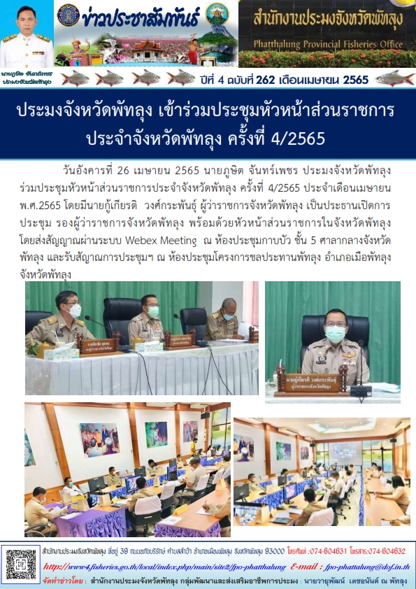 วันอังคารที่ 26 เมษายน 2565 นายภูษิต จันทร์เพชร ประมงจังหวัดพัทลุงร่วมประชุมหัวหน้าส่วนราชการประจำจังหวัดพัทลุง ครั้งที่ 4/2565 ประจำเดือนเมษายน พ.ศ.2565 โดยมีนายกู้เกียรติ วงศ์กระพันธุ์ ผุ้ว่าราชการจังหวัดพัทลุง เป็นประธานเปิดการประชุม รองผู้ว่าราชการจังหวัดพัทลุง พร้อมด้วยหัวหน้าส่วนราชการในจังหวัดพัทลุงโดยส่งสัญญาณผ่านระบบ Webex Meeting ณ ห้องประชุมกาบบัว ชั้นที่ 5 ศาลากลางจังหวัดพัทลุง และรับสัญญาณการประชุมฯ ณ ห้องประชุมโครงการชลประทานพัทลุง อำเภอเมืองพัทลุง จังหวัดพัทลุง
