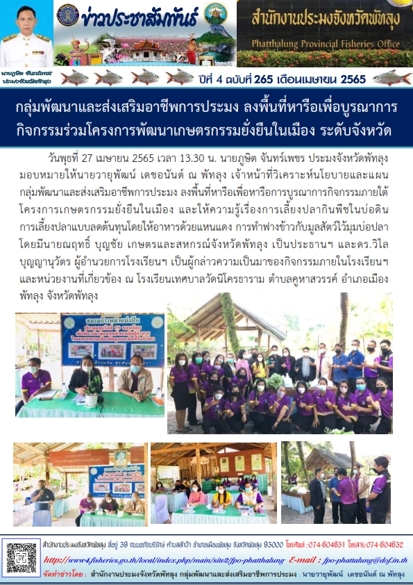 วันพุธที่ 27 เมษายน 2565 เวลา 13.30 น. นายภูษิต จันทร์เพชร ประมงจังหวัดพัทลุง มอบหมายให้นายวายุพัฒน์ เดชอนันต์ ณ พัทลุง เจ้าหน้าที่วิเคราะห์นโยบายและแผน กลุ่มพัฒนาและส่งเสริมอาชีพการประมง ลงพื้นที่เพื่อหารือการบูรณาการกิจกรรมภายใต้โครงการเกษตรกรรมยั่งยืนในเมือง และให้ความรู้เรื่องการเลี้ยงปลากินพืชในบ่อดิน การเลี้ยงปลาแบบลดต้นทุนโดยให้อาหารด้วยแหนแดง การทำฟางข้าวกับมูลสัตว์ไว้มุมบ่อปลา โดยมี นายณฤทธิ์ บุญชัย เกษตรและสหกรณ์จังหวัดพัทลุง เป็นประธานฯและดร.วิไล บุญญานุวัตร ผู้อำนวยการโรงเรียนฯ เป็นผู้กล่าวความเป็นมาของกิจกรรมภายในโรงเรียนฯและหน่วยงานที่เกี่ยวข้อง ณ โรงเรียนเทศบาลวัดนิโครธาราม ตำบลคูหาสวรรค์ อำเภอเมืองพัทลุง จังหวัดพัทลุง