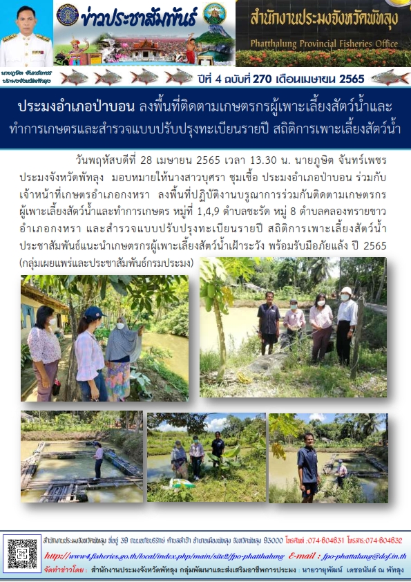 วันที่ 28  เมษายน 2565 เวลา 13.30 น. นายภูษิต  จันทร์เพชร ประมงจังหวัดพัทลุง มอบหมายให้นางสาวบุศรา  ชุมเชื้อ ประมงอำเภอป่าบอน ร่วมกับเจ้าหน้าที่เกษตรอำเภอกงหรา  ลงพื้นที่ปฎิบัติงานบรูณาการร่วมกันติดตามเกษตรกรผู้เพาะเลี้ยงสัตว์น้ำและทำการเกษตร หมู่ที่ 1,4,9 ตำบลชะรัด หมู่ 8 ตำบลคลองทรายขาว สำรวจแบบปรับปรุงทะเบียนรายปี สถิติการเพาะเลี้ยงสัตว์น้ำ พร้อมประชาสัมพันธ์แนะนำเกษตรกรผู้เพาะเลี้ยงสัตว์น้ำเฝ้าระวัง พร้อมรับมือภัยแล้ง ปี 65 (กลุ่มเผยแพร่และประชาสัมพันธ์กรมประมง)
