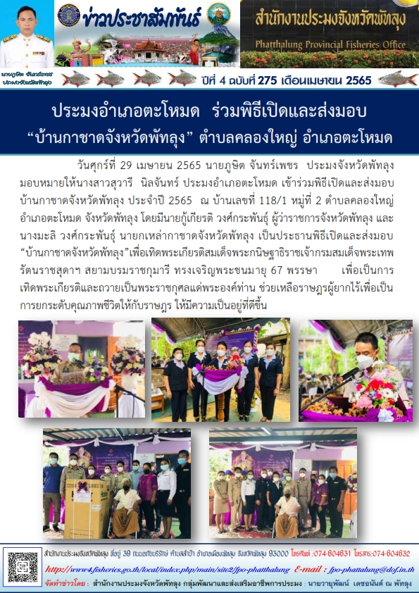 วันศุกร์ที่ 29 เมษายน 2565 นายภูษิต จันทร์เพชร  ประมงจังหวัดพัทลุง  มอบหมายให้นางสาวสุวารี  นิลจันทร์ ประมงอำเภอตะโหมด เข้าร่วมพิธีเปิดและส่งมอบ  บ้านกาชาดจังหวัดพัทลุง ประจำปี 2565  ณ บ้านเลขที่ 118/1 หมู่ที่ 2 ตำบลคลองใหญ่ อำเภอตะโหมด จังหวัดพัทลุง โดยมีนายกู้เกียรติ วงศ์กระพันธุ์ ผู้ว่าราชการจังหวัดพัทลุง และนางมะลิ วงศ์กระพันธุ์ นายกเหล่ากาชาดจังหวัดพัทลุง เป็นประธานพิธีเปิดและส่งมอบ “บ้านกาชาดจังหวัดพัทลุง”เพื่อเทิดพระเกียรติสมเด็จพระกนิษฐาธิราชเจ้ากรมสมเด็จพระเทพรัตนราชสุดาฯ สยามบรมราชกุมารี ทรงเจริญพระชนมายุ 67 พรรษา เพื่อเป็นการเทิดพระเกียรติและถวายเป็นพระราชกุศลแด่พระองค์ท่าน ช่วยเหลือราษฎรผู้ยากไร้เพื่อเป็นการยกระดับคุณภาพชีวิตให้กับราษฎร ให้มีความเป็นอยู่ที่ดีขึ้น