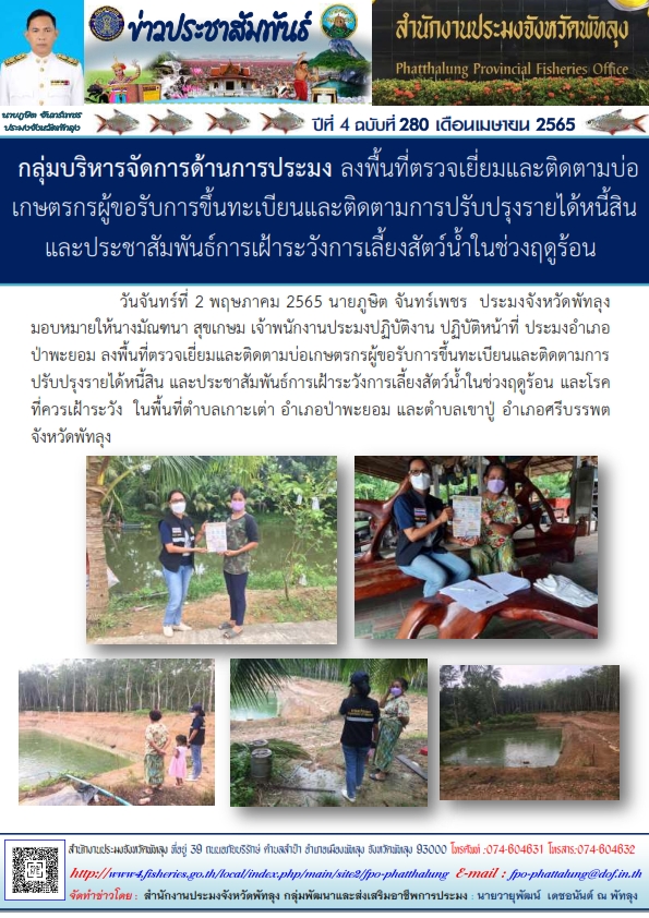 วันจันทร์ที่ 2 พฤษภาคม 2565 นายภูษิต  จันทร์เพชร ประมงจังหวัดพัทลุง มอบหมายให้ นางมัณฑนา สุขเกษม เจ้าพนักงานประมงปฏิบัติงาน ปฏิบัติหน้าที่ ประมงอำเภอป่าพะยอม เข้าติดตามบ่อเกษตรกรผู้ขอรับการขึ้นทะเบียนและติดตามการปรับปรุงรายได้หนี้สิน และประชาสัมพันธ์การเฝ้าระวังการเลี้ยงสัตว์น้ำในช่วงฤดูร้อนและโรคที่ควรเฝ้าระวัง  ในพื้นที่ตำบลเกาะเต่า อำเภอป่าพะยอม และตำบลเขาปู่อำเภอศรีบรรพต จังหวัดพัทลุง