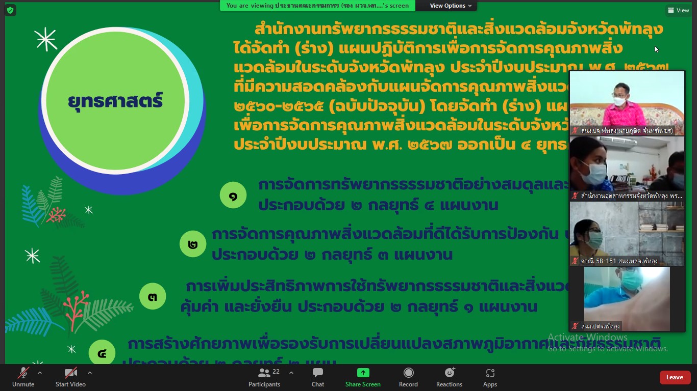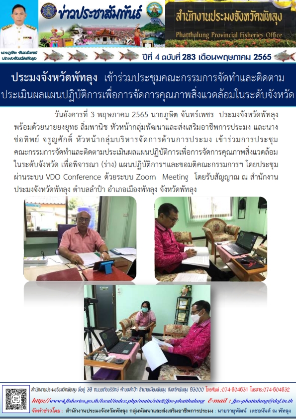 วันอังคารที่ 3 พฤษภาคม 2565 นายภูษิต จันทร์เพชร  ประมงจังหวัดพัทลุง   พร้อมด้วยนายยงยุทธ ลิ่มพานิช หัวหน้ากลุ่มพัฒนาและส่งเสริมอาชีพการประมง และนางช่อทิพย์ จรูญศักดิ์ หัวหน้ากลุ่มบริหารจัดการด้านการประมง เข้าร่วมการประชุม คณะกรรมการจัดทำและติดตามประเมินผลแผนปฏิบัติการเพื่อการจัดการคุณภาพสิ่งแวดล้อม ในระดับจังหวัด เพื่อพิจารณา (ร่าง) แผนปฏิบัติการฯและขอมติคณะกรรมการฯ โดยประชุม ผ่านระบบ VDO Conference ด้วยระบบ Zoom  Meeting  โดยรับสัญญาณ ณ สำนักงาน ประมงจังหวัดพัทลุง ตำบลลำปำ อำเภอเมืองพัทลุง จังหวัดพัทลุง