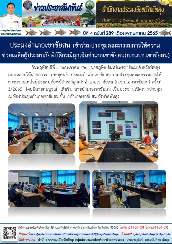 วันพฤหัสบดีที่ 5 พฤษภาคม 2565  เวลา 13.00 น นายภูษิต จันทร์เพชร  ประมงจังหวัดพัทลุง มอบหมายให้นายถาวร  รุกขสุคนธ์  ประมงอำเภอเขาชัยสน ร่วมประชุมคณะกรรมการให้ความช่วยเหลือผู้ประสบภัยพิบัติกรณีฉุกเฉินอำเภอเขาชัยสน (ก.ช.ภ.อ เขาชัยสน) ครั้งที่  3/2665  ณ ห้องประชุมอำเภอเขาชัยสน ชั้น 2  โดยมีนายสมบูรณ์  เต็มชื่น นายอำเภอเขาชัยสน เป็นประธาน
