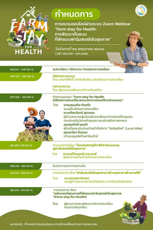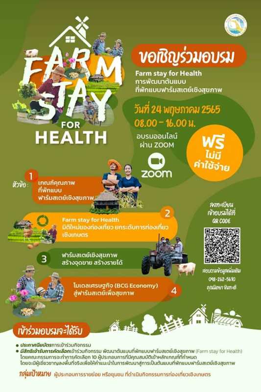 ประชาสัมพันธ์เชิญชวนผู้ประกอบการรายย่อยและชุมชนเข้าร่วมการอบรม Farm stay for Health การพัฒนาต้นแบบที่พักแบบฟาร์มสเตย์เชิงสุขภาพ ผ่านระบบออนไลน์ Zoom
