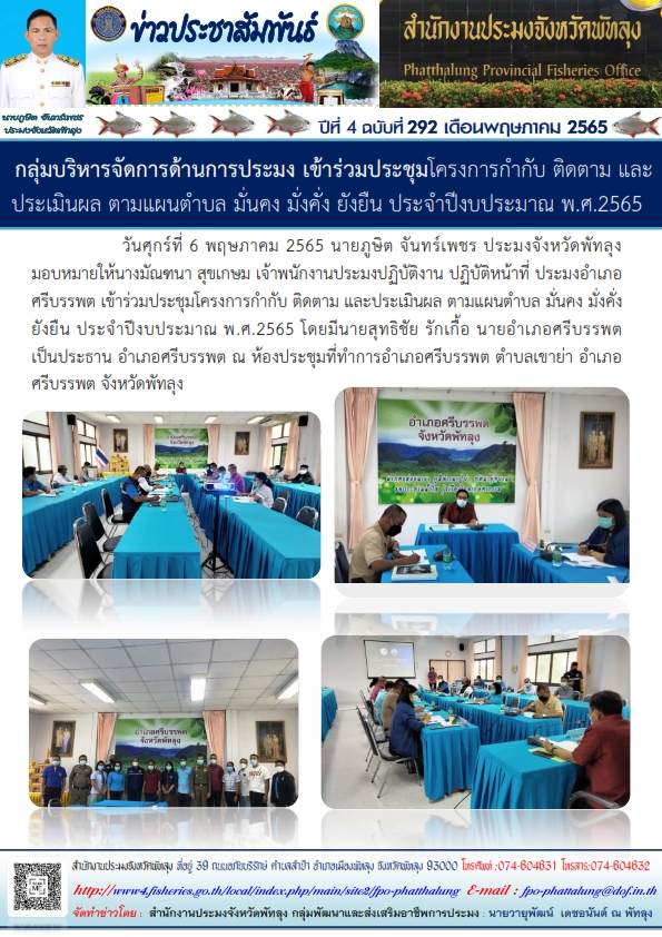 วันศุกร์ที่ 6 พฤษภาคม 2565 นายภูษิต จันทร์เพชร ประมงจังหวัดพัทลุง  มอบหมายให้นางมัณฑนา สุขเกษม เจ้าพนักงานประมงปฏิบัติงาน ปฏิบัติหน้าที่ ประมงอำเภอ ศรีบรรพต เข้าร่วมประชุมโครงการกำกับ ติดตาม และประเมินผล ตามแผนตำบล มั่นคง มั่งคั่ง ยังยืน ประจำปีงบประมาณ พ.ศ.2565 โดยมีนายสุทธิชัย รักเกื้อ นายอำเภอศรีบรรพต  เป็นประธาน อำเภอศรีบรรพต ณ ห้องประชุมที่ทำการอำเภอศรีบรรพต ตำบลเขาย่า อำเภอ ศรีบรรพต จังหวัดพัทลุง