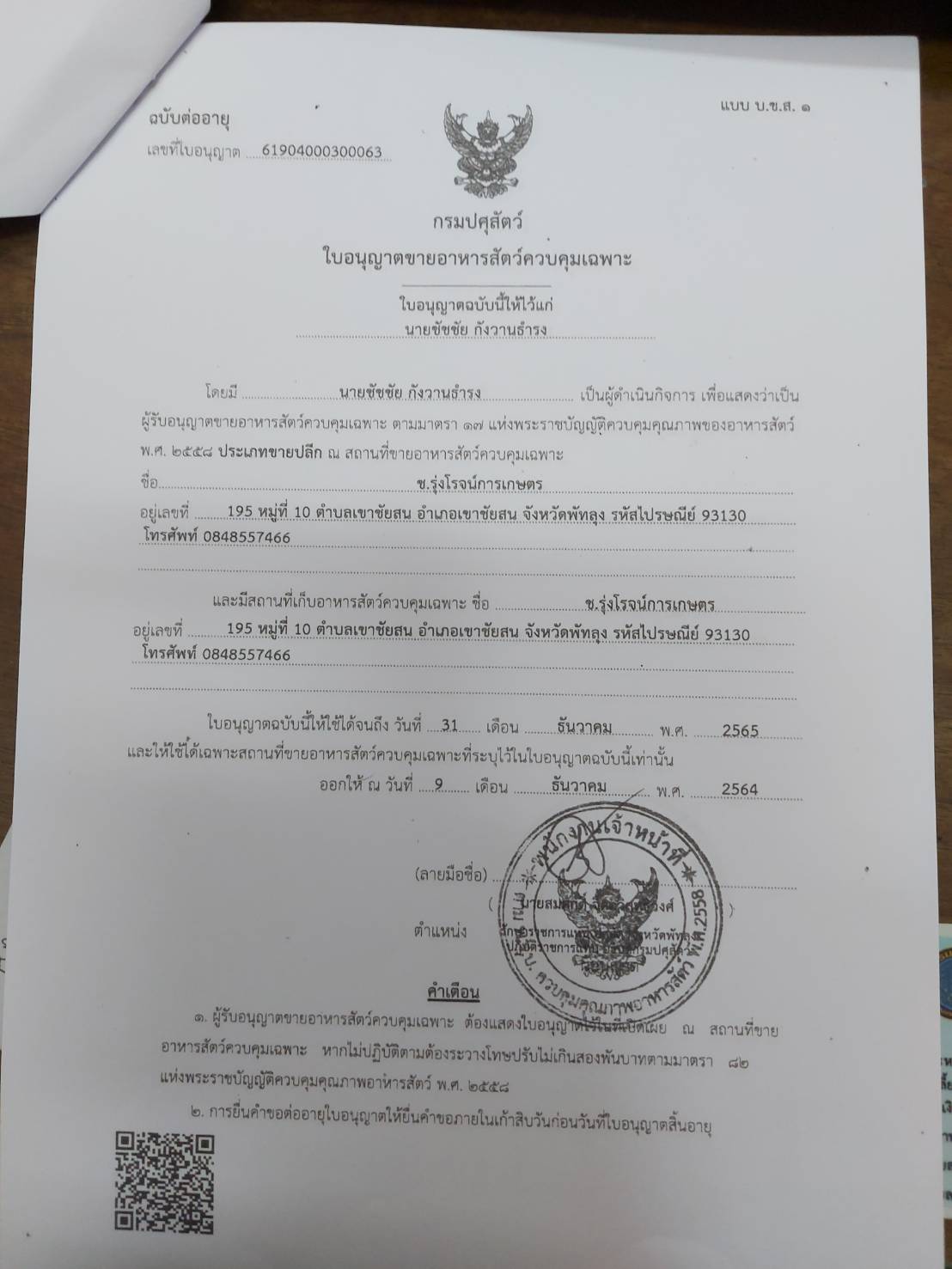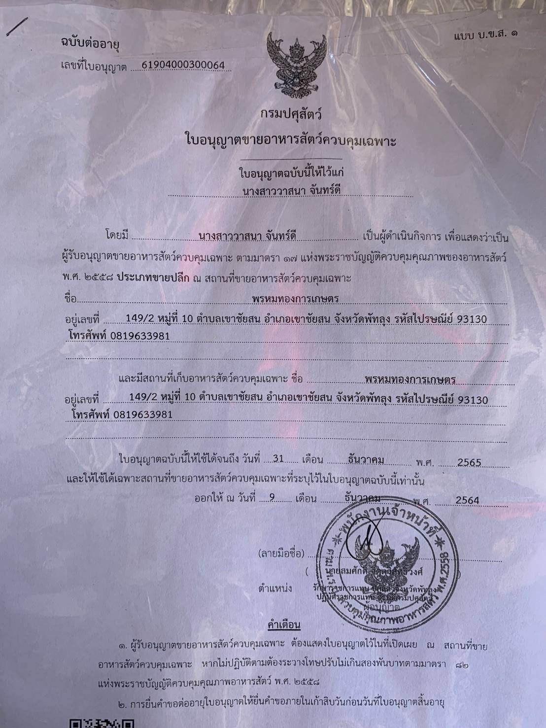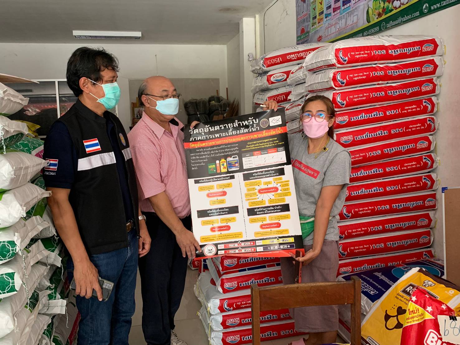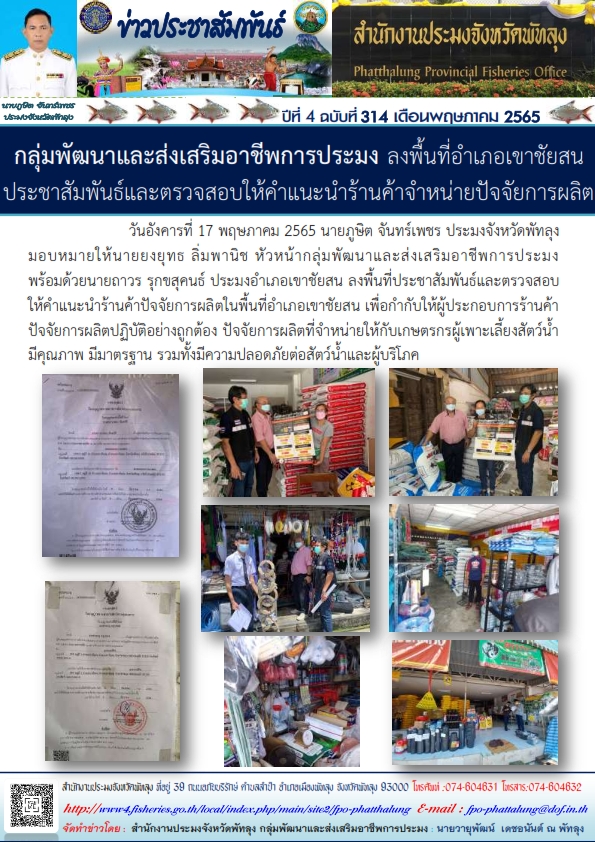 วันที่ 17 พฤษภาคม 2565 นายภูษิต จันทร์เพชร ประมงจังหวัดพัทลุง มอบหมายให้ นายยงยุทธ ลิ่มพานิช หัวหน้ากลุ่มพัฒนาและส่งเสริมอาชีพการประมง  พร้อมด้วยนายถาวร  รุกขสุคนธ์  ประมงอำเภอเขาชัยสน  ลงพื้นที่ประชาสัมพันธ์ ตรวจสอบให้คำแนะนำร้านค้าปัจจัยการผลิตในพื้นที่อำเภอเขาชัยสน เพื่อกำกับให้ผู้ประกอบการร้านค้าปัจจัยการผลิตปฏิบัติอย่างถูกต้อง  ปัจจัยการผลิตที่จำหน่ายให้กับเกษตรกรผู้เพาะเลี้ยงสัตว์น้ำมีคุณภาพ  มาตรฐาน รวมทั้งมีความปลอดภัยต่อสะตว์น้ำและผู้บริโภค