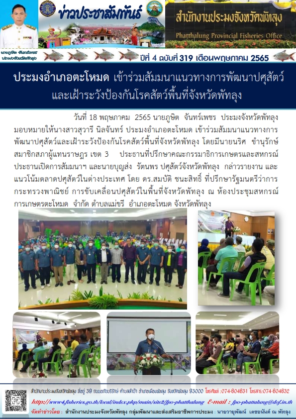 ประมงอำเภอตะโหมด เข้าร่วมสัมมนาแนวทางการพัฒนาปศุสัตว์และเฝ้าระวังป้องกันโรคสัตว์พื้นที่จังหวัดพัทลุง..คลิก