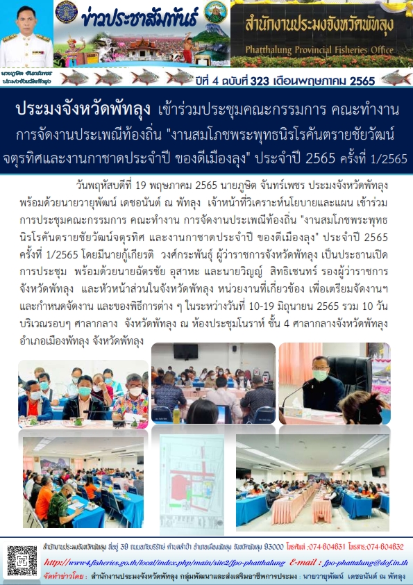 วันที่ 19 พฤษภาคม 2565 นายภูษิต  จันทร์เพชร ประมงจังหวัดพัทลุง  พร้อมด้วยนายวายุพัฒน์ เดชอนันต์ ณ พัทลุง  เจ้าหน้าที่วิเคราะห์นโยบายและแผน เข้าร่วมการประชุมคณะกรรมการ คณะทำงาน การจัดงานประเพณีท้องถิ่น "งานสมโภชพระพุทธนิรโรคันตรายชัยวัฒน์จตุรทิศ และงานกาชาดประจำปี ของดีเมืองลุง" ประจำปี 2565 ครั้งที่ 1/2565 โดยมีนายกู้เกียรติ  วงศ์กระพันธ์ุ ผู้ว่าราชการจังหวัดพัทลุง เป็นประธานเปิดการประชุม  พร้อมด้วยนายฉัตรชัย อุสาหะ และนายวิญญ์  สิทธิเชนทร์ รองผุู้ว่าราชการพัทลุง  เพื่อเตรียมจัดงานฯ  และกำหนดจัดงาน และของพิธีการต่าง ๆ ระหว่างวันที่ 10-19 มิถุนายน 2565 รวม 10 วัน  บริเวณรอบๆ ศาลากลาง  จังหวัดพัทลุง   ณ ห้องประชุมโนราห์ ชั้น 4 ศาลากลางจังหวัดพัทลุง อำเภอเมืองพัทลุง จังหวัดพัทลุง