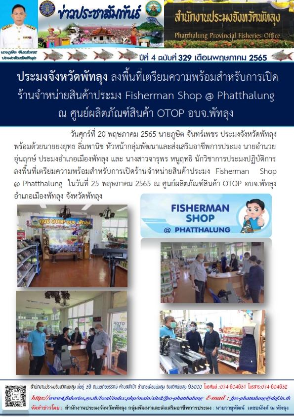 วันศุกร์ที่ 20 พฤษภาคม 2565 นายภูษิต จันทร์เพชร ประมงจังหวัดพัทลุง พร้อมด้วยนายยงยุทธ ลิ่มพานิช หัวหน้ากลุ่มพัฒนาและส่งเสริมอาชีพการประมง นายอำนวย อุ่นฤกษ์ ประมงอำเภอเมืองพัทลุง และ นางสาวจารุพร หนูฤทธิ นักวิชาการประมงปฏิบัติการ ลงพื้นที่เตรียมความพร้อมสำหรับการเปิดร้าน Fisherman Shop @ Phatthalungในวันที่ 25 พฤษภาคม 2565 ณ ศูนย์ผลิตภัณฑ์สินค้า OTOP อบจ.พัทลุง