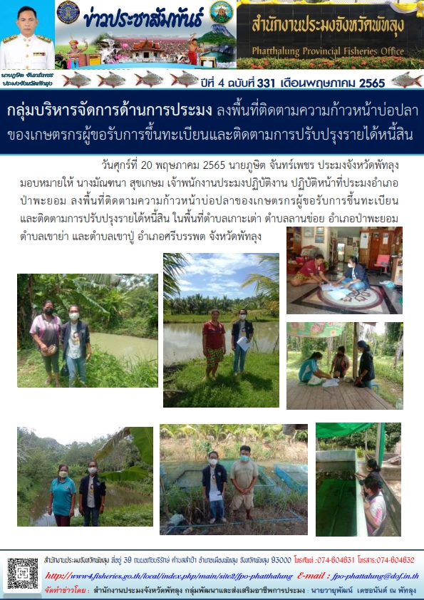 วันที่ 20 พฤษภาคม2565 นายภูษิต  จันทร์เพชร ประมงจังหวัดพัทลุง มอบหมายให้ นางมัณฑนา สุขเกษม เจ้าพนักงานประมงปฏิบัติงาน ปฏิบัติหน้าที่ ประมงอำเภอป่าพะยอม เข้าติดตามบ่อเกษตรกรผู้ขอรับการขึ้นทะเบียนและติดตามการปรับปรุงรายได้หนี้สิน ในพื้นที่ตำบลเกาะเต่า ตำบลลานข่อย อำเภอ        ป่าพะยอม ตำบลเขาย่าและตำบลเขาปู่ อำเภอศรีบรรพต จังหวัดพัทลุง