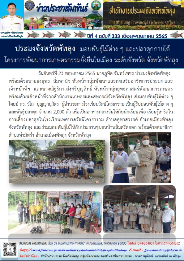 ประมงจังหวัดพัทลุง มอบพันธุ์ไม้ต่างๆ และปลาดุกภายใต้ โครงการพัฒนาการเกษตรกรรมยั่งยืนในเมือง ระดับจังหวัด จังหวัดพัทลุง..คลิก