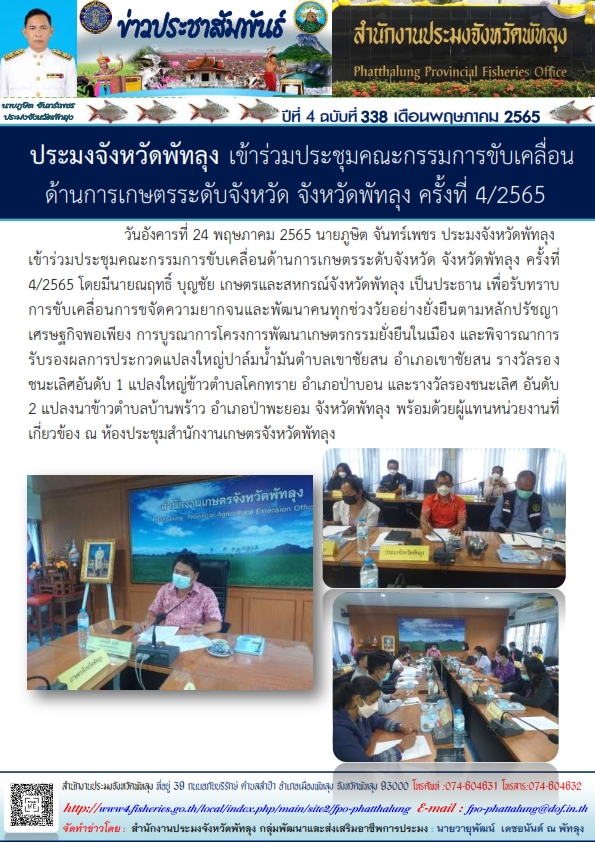วันอังคารที่ 24 พฤษภาคม 2565 นายภูษิต จันทร์เพชร ประมงจังหวัดพัทลุง  เข้าร่วมประชุมคณะกรรมการขับเคลื่อนด้านการเกษตรระดับจังหวัด จังหวัดพัทลุง ครั้งที่ 4/2565 โดยมีนายณฤทธิ์ บุญชัย เกษตรและสหกรณ์จังหวัดพัทลุง เป็นประธาน เพื่อรับทราบการขับเคลื่อนการขจัดความยากจนและพัฒนาคนทุกช่วงวัยอย่างยั่งยืนตามหลักปรัชญาเศรษฐกิจพอเพียง การบูรณาการโครงการพัฒนาเกษตรกรรมยั่งยืนในเมือง และพิจารณาการรับรองผลการประกวดแปลงใหญ่ปาล์มน้ำมันตำบลเขาชัยสน อำเภอเขาชัยสน รางวัลรองชนะเลิศอันดับ 1 แปลงใหญ่ข้าวตำบลโคกทราย อำเภอป่าบอน และรางวัลรองชนะเลิศ อันดับ 2 แปลงนาข้าวตำบลบ้านพร้าว อำเภอป่าพะยอม จังหวัดพัทลุง พร้อมด้วยผู้แทนหน่วยงานที่เกี่ยวข้อง ณ ห้องประชุมสำนักงานเกษตรจังหวัดพัทลุง