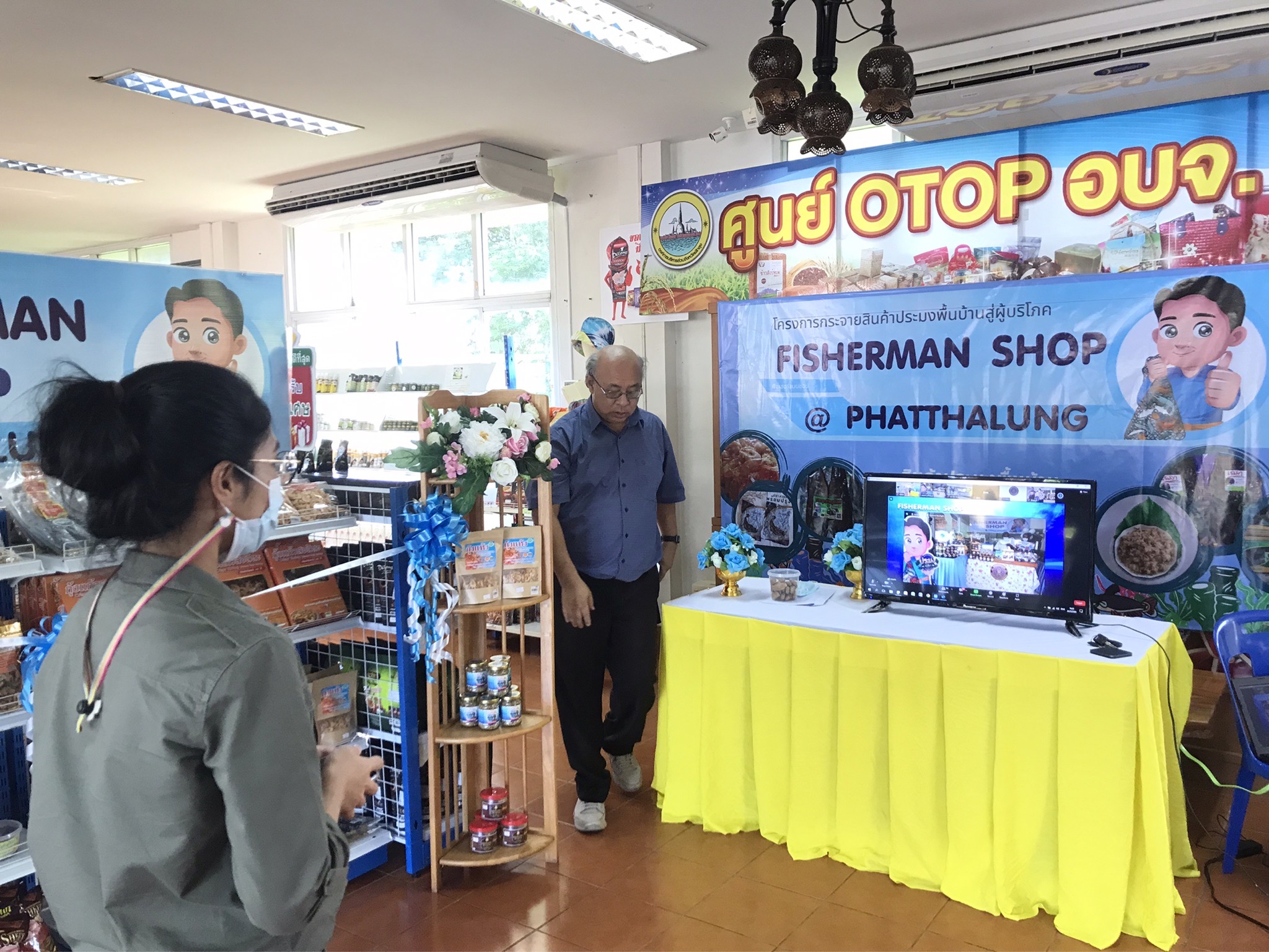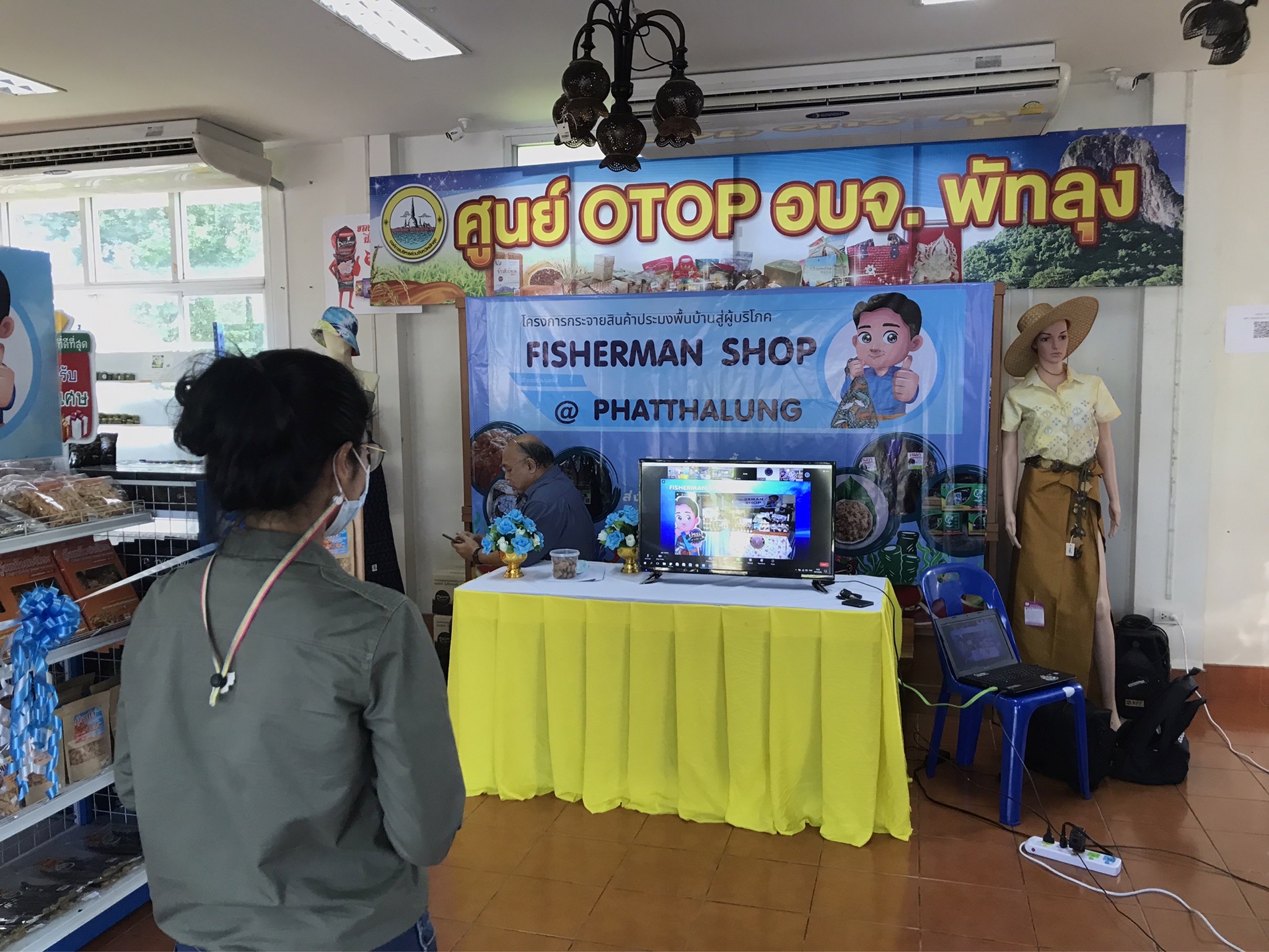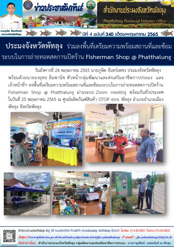 วันที่  24 พฤษภาคม 2565 นายภูษิต จันทร์เพชร ประมงจังหวัดพัทลุง พร้อมด้วยนายยงยุทธ ลิ่มพานิช หัวหน้ากลุ่มพัฒนาและส่งเสริมอาชีพการประมง?  และเจ้าหน้าที่ฯ ลงพื้นที่เตรียมความพร้อมสถานที่และซ้อมระบบในการถ่ายทอดสด การเปิดร้าน Fisherman Shop @ Phatthalung ผ่านระบบ Zoom meeting ทั่วประเทศ ในวันที่ 25 พฤษภาคม 2565 ณ ศูนย์ผลิตภัณฑ์สินค้า otop อบจ. พัทลุง อำเภออำเภอเมืองพัทลุง จังหวัดพัทลุง